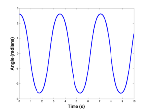 [theta0,theta1,time] = pend(InitialAngle,InitialVelocity,len,dt,stopTime); AnimationSpeed = 1;