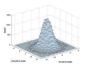 - Homework C.1: What is special about the joint density of independent random variables? How can you tell from the second 3D histogram that V1 and V2 are not independent? For this problem, think more about the definition of independence and use it to justify your answer. For more intuition, you could try plotting 3D histograms of other independent random variables [RV1, RV2] where the random variables are functions of different calls to rand or randn (as toward the end of Lab B). This extra work could be the basis of your bonus problem, if you want. See filename conventions.