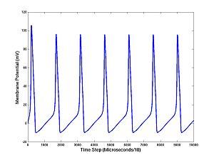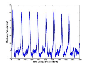 N = 0.01; % Set Noise level I = 10; % Set Injected current (mA) V = zeros(10000,1); % Allocate memory V(1) = 0; % Set Initial membrane potential