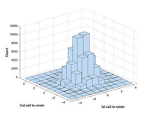 What are we looking at: rows of bins correspond to the first call of randn and columns correspond to the second. The bins vary along two dimensions (first call to randn and second call to randn). The following explains the differences in the densities: